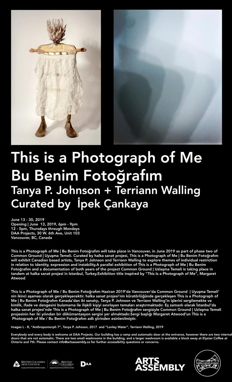 Bu Benim Fotoğrafım | This is a Photograph of Me is the second year exhibition of COMMON GROUND | UYUŞMA TEMELİ, the two-year curatorial exchange project between halka sanat projesi and ARTS ASSEMBLY Vancouver. Curated by İpek Çankaya from halka sanat projesi, Bu Benim Fotoğrafım | This is a Photograph of Me and related talks take place in 13 – 30 June 2019 in Vancouver and shows works by Canada based artists Tanya P. Johnson and Terriann Walling. A documentation exhibition on project’s both years takes place in 02 July – 14 August 2019 at halka sanat projesi in Istanbul. Exhibition title is inspired by Margaret Atwood's poem of the same title.